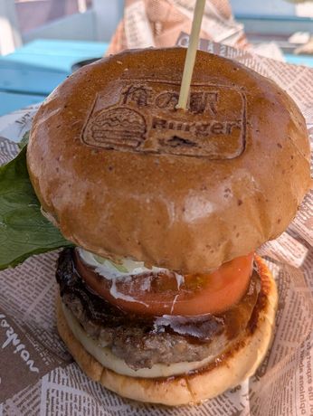 途中の休憩スポットで、淡路島名物の玉ねぎ入りハンバーガーを食す。